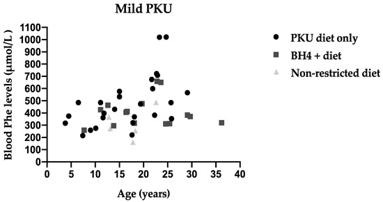 The evidence to support an upper blood Phe level of 360 µmol/L in children aged under <12 y is convincing and is supported by all three PKU Guidelines/Consensus [1,20,22]. Therefore, the low percentage of blood Phe levels within target range for children aged < 12 y was a concern. Even children with mild PKU achieved <50% of blood Phe levels < 360 µmol/L. There is much evidence to suggest that the inability to sustain good metabolic control in childhood is associated with a decline in IQ (intelligence quotient) score and executive function and will have a negative influence in adulthood [14,17,18]. A meta-analysis estimated that an increase of 100 μmol/L in lifetime Phe levels predicts an average 1.9 to 4.1 point reduction in IQ over a range of Phe from 394 to 666 μmol/L [15]. Jaha et al. in 2017 showed that high blood Phe levels in childhood, affect adult cognitive flexibility, executive motor control, executive function in daily life and adult mental health [17]. Weglage et al. (2013) also showed that high blood Phe levels in childhood and adolescence were related to poorer IQ, information processing and attention in adulthood [27]. It is evident that alternative treatment choices are necessary to help improve the control of this group of patients with PKU. Much attention is directed at identifying effective non dietary treatments for adults but is essential that the paediatric population is not neglected. However, even when children were on BH4, only 49% had blood Phe levels within the target therapeutic range.