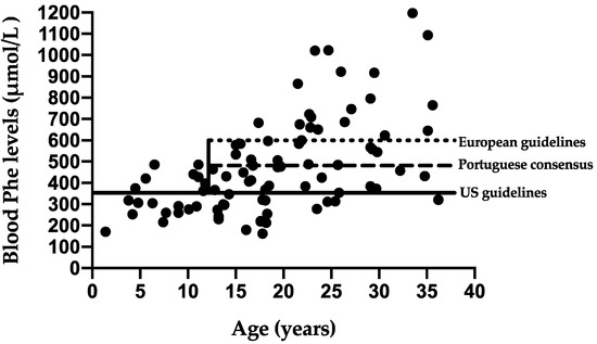 Blood Phe levels were compared with the European PKU Guidelines (recommended blood Phe levels 120–360 μmol/L up to 12 y and 120–600 μmol/L onwards) [1], US PKU guidelines (120–360 μmol/L throughout life) [20] and Portuguese Consensus (blood Phe levels 120–360 μmol/L up to 12 y and 120–480 μmol/L onwards) [22].
