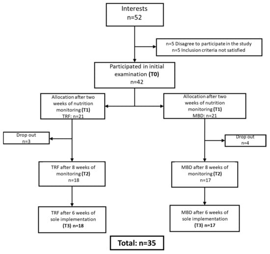A total of 52 participants were recruited at the local gym. After the initial interview and information about the study design, 42 participants (m = 21, f = 21) took part in the study. Seven subjects (m = 7) were unable to successfully complete the second phase. All three dropouts from the TRF group had to discontinue the study due to illness, whereas the four MBD subjects dropped out for family- and work-related reasons. After the third phase, no further dropouts were recorded, and the data of 35 subjects were analysed. The inclusion and exclusion of the subjects can be seen in Figure 2.