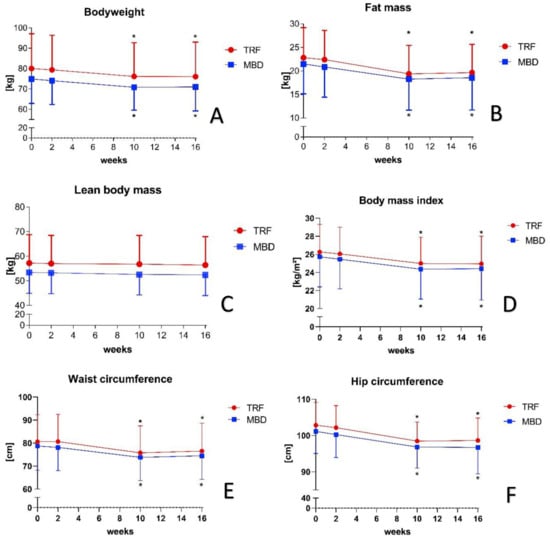 Changes in body composition in the TRF and MBD group ((A) body weight; (B) fat mass; (C) lean body mass; (D) body mass index; (E) waist circumference; (F) hip circumference). Significant differences were set with p < 0.05 and marked with * for time differences to T0. Abbreviations: MBD = macronutrient-based diet; TRF = time-restricted feeding.