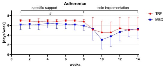 Adherence of the TRF and MBD groups over 14 weeks. Week 1–8: both groups with specific support. Week 9–14: without specific support. Significant group differences were set with p < 0.05 and marked with #.