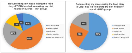 After the 14-week intervention, a questionnaire was used to assess the influence of the FDDB Extender Diary documentation on diet. In total, 61% percent of the TRF group answered that the documentation had a positive influence on nutrition and 39% answered that it had little to no influence. In contrast, 82% of the MBD group reported a positive influence. The exact percentage distribution can be found in Figure 5.