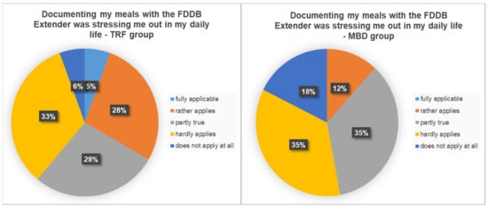 In answer to the question of how the diet could be implemented in everyday life, the TRF group reported an average score of 7.26 out of 10. The MBD group had an average score of 8.4 out of 10. In response to the question of whether the documentation of nutrition stressed them in everyday life, about one-third of the TRF group stated that the documentation stressed them (34%). For 66%, documentation was not an additional stress factor in everyday life. In the MBD group, only 12% of the respondents felt that the documentation was an additional stress factor. The exact distribution of the five scales can be seen in Figure 6.