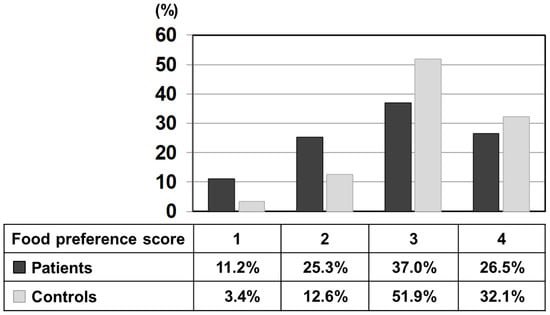 Figure 1 shows the percentage of each score selected by patients and controls using the relative frequency distribution for all foods. The mean value of the preference score (a scale of 1–4) of patients was 2.79 ± 0.96, which was significantly lower than that of the control (3.13 ± 0.75). To illustrate further, 3 points (like) and 4 points (like very much) accounted for 84% in the control, while the same scores accounted for 63.5% in the patients, significantly lower than the control. On the other hand, 1 point (dislike very much) and 2 points (dislike) accounted for 36.5% in patients, significantly higher than 16.0% in the control. In other words, this result indicates that the patient’s unique diet relates to the choice of dislikes.