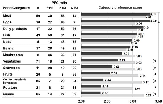 PFC ratio of the 13 food categories and the category preference score marked by patients with citrin deficiency and control subjects. Black bars: patients, grey bars: control subjects. * p < 0.05. The category preference score is the averaged preference score of foods within the same category, marked by patients and controls.