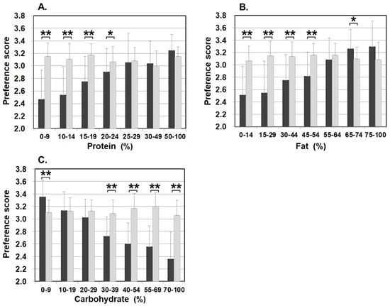 Food preference scores marked by patients and controls for foods broken down by the PFC ratio of each nutrient ((A) protein, (B) fat, and (C) carbohydrate). Black bars: patients, grey bars: control subjects. * p < 0.05, ** p < 0.001.