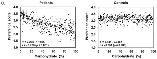 Figure 3 illustrates food preference according to the nutrition content of foods. In comparison to the control, patients scored significantly lower for foods containing 20–24% or less protein, 45–54% or less fat, and 30% or more carbohydrates. The nutrition content did not influence the preference score of the control. In addition, we also analyzed the correlation between the content ratios of the protein, fat, and carbohydrate in food and the preference score (Figure 4). For patients, the higher the protein content was, the higher the preference score became, showing a significant positive correlation (r = 0.499, p < 0.001). The same was true for fat, the higher the content was, the higher the preference score became, showing a significantly positive correlation (r = 0.505, p < 0.001). On the other hand, for carbohydrates, the higher the content was, the lower the preference score became, with a significantly strong negative correlation (r = −0.703, p < 0.001). No such correlation was found in the control.