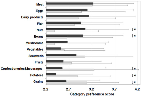 The averaged food preference scores of patients and controls in five age groups are listed in Table 2. The average preference score of the patient group was significantly lower in all age groups, including the 2–6 years age group than that of the control group. Figure 5 shows the category preference scores of 2–6 years old patients and the control. The control group rated low for nuts, beans, mushrooms, and vegetables which are all commonly disfavored by small children [27,28,29]. Of the said categories, nuts and beans were marked significantly higher by patients compared to the control. On the other hand, confectioneries/beverages, potatoes, and grains were marked significantly lower by patients than the control in this age group. Patients of the 2–6 years old group rated their preference in a similar fashion as patients as a whole (Figure 2) rather than the age-matched control group. The results indicate that the patients’ sense of preference and aversion to carbohydrates are already determined as early as the age of 2–6 years (Figure 5).