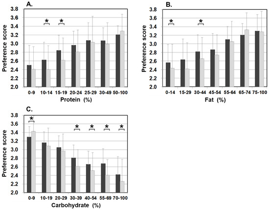 Food preference scores marked by male patients and female patients for foods broken down by the PFC ratio of each nutrient ((A) protein, (B) fat, and (C) carbohydrate). Black bars: male patients, grey bars: female patients. * p < 0.05.