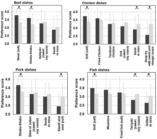 Food preference scores marked by patients and controls for foods broken down by cooking methods and seasonings of beef, chicken, pork, and fish dishes. Black bars: patients, grey bars: control subjects. * p < 0.05.