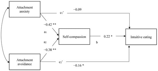 The paths tested in the mediation model using structural equation modelling are displayed in Figure 1. Because all possible paths were specified in the model, it is said to be saturated. Saturated models have no degree of freedom; therefore, no fit indices are generated. Results of the structural equation modeling demonstrated that the direct relationship between attachment anxiety and intuitive eating was not significant (c1′: β = −0.09), whereas attachment avoidance was significantly negatively directly associated with intuitive eating, (c2′: β = −0.16). Additionally, both attachment anxiety and avoidance were significantly negatively associated with self-compassion (a1: β = −0.42; a2: β = −0.38). Furthermore, self-compassion was found to be significantly positively associated with intuitive eating (b: β = 0.22). Regarding the mediating role of self-compassion between attachment and intuitive eating, the indirect effect of attachment anxiety on intuitive eating through self-compassion and the indirect effect of attachment avoidance on intuitive eating through self-compassion were found both to be significant. Specifically, self-compassion was shown to significantly mediate the relationship between attachment anxiety and intuitive eating (95% CI = −0.175 to −0.027, p = 0.009) as well as the relationship between attachment avoidance and intuitive eating (95% CI = −0.154 to −0.025, p = 0.010). Thus, when all proposed relationships are modelled simultaneously in a structural equation model, results suggest that self-compassion acts as a significant mediator in the relationship between attachment styles and intuitive eating. Results further suggest that most of the variance associated with attachment anxiety in the prediction of intuitive eating is explained by levels of self-compassion as indicated by the non-significant c1′ path. However, some of the variance in attachment avoidance in the prediction of intuitive eating remains as the c2′ path is significant even though the contribution of self-compassion in the relationship is accounted for.