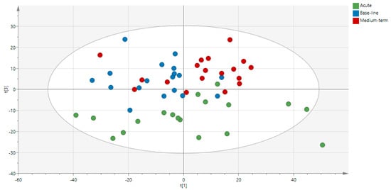 The supervised PLS-DA models for baseline vs. acute and baseline vs. medium-term show good statistical performances with very low probability of overfitting the data for both models (see Figures S2 and S3: for baseline vs. acute: R2Y = 0.993, Q2Y = 0.895, p-value CV-ANOVA = 2.03 × 10−9, intercept cross-validation = −0.14, and for baseline vs. medium-term: R2Y = 0.975, Q2Y = 0.7, p-value CV-ANOVA = 3.75 × 10−6, intercept cross-validation = −0.08). On the basis of the PLS-DA (VIP > 1.2) and p-values (<0.05), a list of discriminant metabolites between groups was established. Among them, 49 metabolites for acute intervention and 36 after medium-term intervention could be putatively identified with a relatively high confidence. As reported in the Venn graph (Figure 2), 11 metabolites were shared between acute and medium-term metabolomes. In total, only 74 compounds were putatively identified, with 11 of them being isomers with the same mass as the original compounds but different retention time. The complete table is provided in the Supplemental Information (Tables S2 and S3).