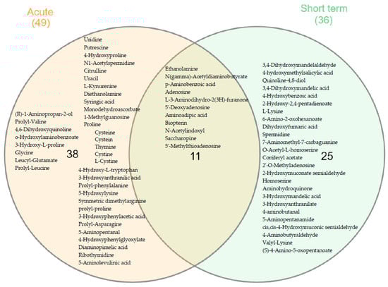 Venn diagram of the main discriminant metabolites identified after acute and medium-term intervention (only metabolites with VIP > 1.2 and p-value < 0.05 are shown).