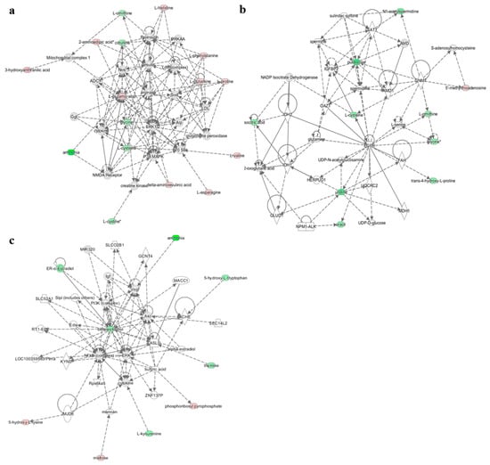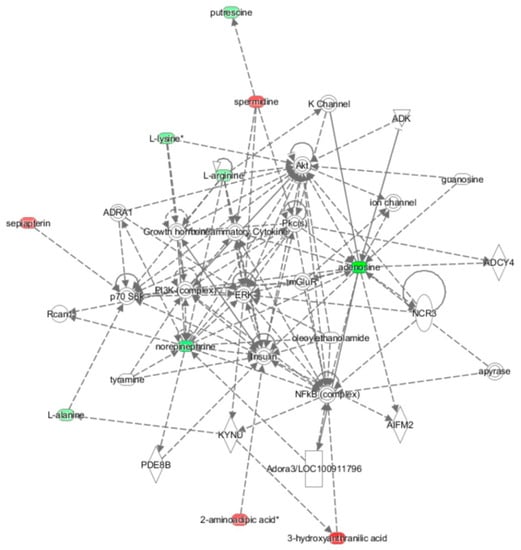 Considering up- and downregulated discriminant metabolites, IPA software predicted significant effects (p < 0.05) related to some cellular functions and physiological system development. Regarding cellular functions, the top associated categories were protein synthesis (p-value = 1.59 × 10−7) (Supplementary Figure S1a), cellular growth and proliferation (p-value = 2.17 × 10−6) (Supplementary Figure S1b), and amino acid metabolism and molecular transport (p-value = 1.09 × 10−5) (Supplementary Figure S1c). Meanwhile, for physiological system development and function, the most relevant effect was related to hepatic system development and function (p-value = 7.78 × 10−8), suggesting possible participation in the maintenance of normal liver function (Supplementary Figure S1d) and immune cell trafficking (p-value = 8.35 × 10−7), with a role in the recruitment and performance of immune system cells (Supplementary Figure S1e). Interestingly, some metabolite networks were activated, including alkaline phosphatase (Supplementary Figure S1f), albumin (Supplementary Figure S1g), potassium levels (Supplementary Figure S1h), and lactate dehydrogenase (LDH) release (Supplementary Figure S1i).