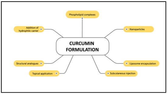However, the main drawback of curcumin supplementation is its poor bioavailability, which is characterised by its poor absorption, rapid metabolism and rapid elimination [23]. Normally, curcumin is metabolised in the liver and intestines [24]. It is converted into water-soluble metabolites (glucuronides and sulphates) and excreted in the urine [23]. Oral administration of curcumin in rats showed 40% excretion in the faeces [25]. Thus, various curcumin nanoformulations, such as nanoparticles, liposome encapsulation, phospholipid complexes, structural analogues, subcutaneous injection, topical application and hydrophilic carrier addition have been introduced to maximise their bioavailability and activity and preventing curcumin from hydrolysis inactivation (Figure 3). These nanoformulations work by improving curcumin particle size, surface area, surface charge, hydrophobicity, as well as enhancing small intestine permeation [26]. Furthermore, curcumin nanoformulations have been reported to increase absorption more than 100-fold compared to the unformulated curcumin [27]. For example, curcumin has been formulated in a nano biocompatible form (nanocurcumin) to increase its water solubility and bioavailability. Co-administration of curcumin with piperine, an alkaloid in black pepper, enhances curcumin’s bioavailability by up to 2000% [28]. A synthesised nanoparticle form of curcumin, theracurmin, showed satisfactory plasma concentration after a single dose in healthy controls and cancer patients [29]. In addition, the encapsulation of curcumin in liposomes demonstrated inhibitory effects on endometrial cancer by inducing cell apoptosis, inhibiting cell proliferation and inhibiting invasive and metastatic bioactivities [30]. Due to the variety of effective formulations available nowadays, problems regarding the poor bioavailability of curcumin should no longer be the primary concern. Hence, these curcumin nanoformulations have made a significant contribution to the pharmaceutical industry and have been demonstrated to be beneficial in treating various human diseases [26].