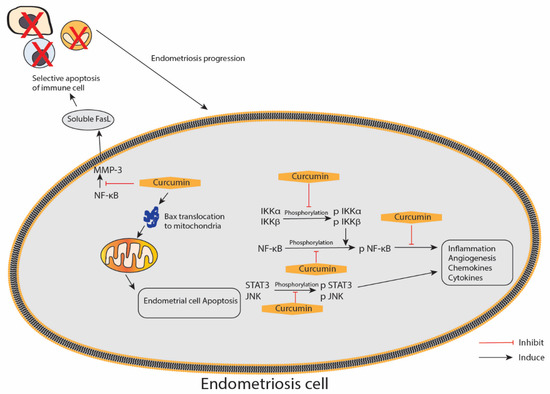 An illustration of the proposed curcumin effect on the inflammatory and apoptotic pathways in endometriosis. IKKα/β—inhibitor of nuclear factor κ-B kinase subunit α/β; JNK—c-Jun N-terminal kinases; NF-κB—nuclear factor κ-light-chain-enhancer of activated B; STAT3—signal transducer and activator of transcription 3; p—phosphorylated form; MMP-3—matrix metalloproteinase 3; FasL—Fas ligands; arrow represents a promotion, and blunt arrow represents inhibition.