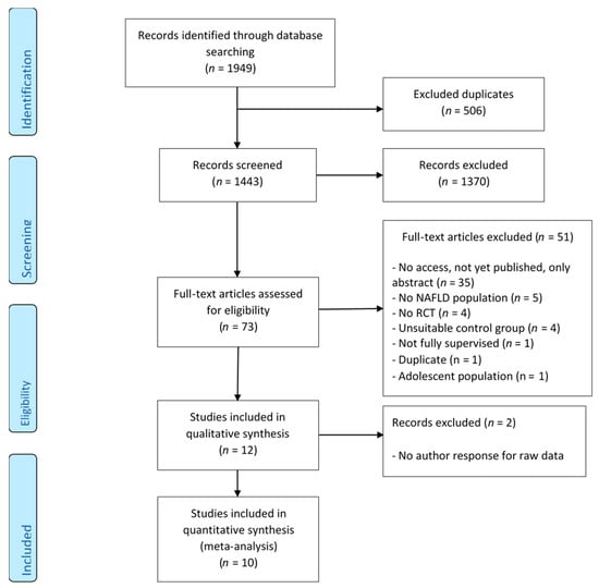 The electronic search (until 13 February 2020) yielded 1949 potentially relevant studies. After removing duplicates and screening through article titles and abstracts, 73 studies were retained for full-text reading. After excluding 61 ineligible studies based on the exclusion/inclusion criteria, 12 RCTs remained for review. Two more studies were excluded after there was no response from the authors for raw data to be included in the meta-analysis [32,33]. Finally, 10 studies were included for the meta-analysis (Table 1). A flow diagram including all stages is presented in Figure 1. One out of the 10 studies had two exercise intervention arms with different exercise regimes—aerobic exercise and resistance training [34]—which were counted as separate RCT exercise intervention arms. Each intervention arm was compared with the control arm and divided into its subgroups (aerobic exercise alone—six RCTs, resistance training alone—three RCTs, and a combination of aerobic exercise and resistance training—two RCTs). In total, 316 individuals with a mean age ranging from 39.7 to 62 years (from both exercise and control groups) were included in the analysis. This included 136 and 192 participants in the exercise and control groups, respectively (Table 2). None of the included studies had subjects with ischemic heart disease, whereas two of the included studies recruited participants with type 2 diabetes (T2D) that was treated with metformin [19,35]. However, no information was available about the number of participants with T2D. Details about other concomitant disorders were not available. Some studies had food records, but no diet results were reported [36,37,38,39,40]. All studies stated no diet changes. In addition, neither the search of gut microbiota and metabolites nor relevant NAFLD gene variations resulted in any studies for this review.