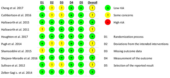- Higgins, J.P.; Altman, D.G.; Gøtzsche, P.C.; Jüni, P.; Moher, D.; Oxman, A.D.; Savović, J.; Schulz, K.F.; Weeks, L.; Sterne, J.A. The Cochrane Collaboration’s tool for assessing risk of bias in randomised trials. BMJ 2011, 343, d5928. [Google Scholar] [CrossRef] [Green Version]