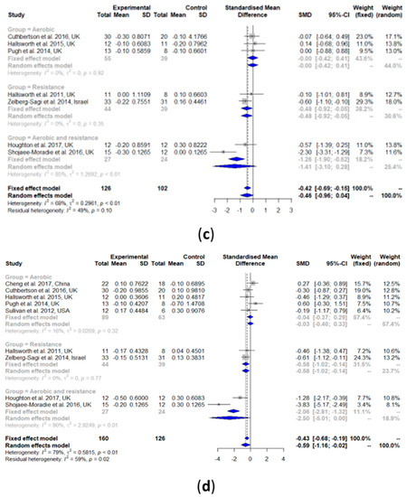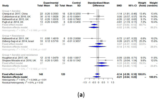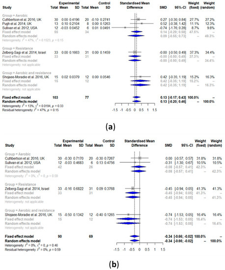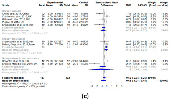 All the studies that measured IHL using MRS (n = 8) were included for the meta-analysis. Two other studies were not considered as they used US, which is not comparable with the results of MRS [34,40]. The results showed that IHL was significantly reduced upon exercise intervention compared with the controls (SMD: −0.76, 95% CI: −1.04, −0.48) (Figure 3a). Heterogeneity in the effect of overall exercise on IHL was not detected (I2 = 0%, τ2 = 0, p = 0.53). Subgroup analyses of aerobic exercise only (SMD: −0.80, 95% CI: −1.14, −0.46) and a combination of aerobic exercise and resistance training (SMD: −0.80, 95% CI: −1.38, −0.22) showed a significant reduction in IHL compared with the controls. Heterogeneity was non-significant for aerobic exercise (I2 = 21%, τ2 = 0.0416, p = 0.28) and the exercise combination (I2 = 0%, τ2 = 0, p = 0.60). A subgroup analysis of resistance training was not possible as there was only one study included.