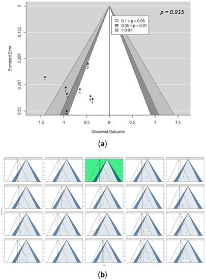 - Kossmeier, M.; Tran, U.S.; Voracek, M. Visual inference for the funnel plot in meta-analysis. Z. Psychol. 2019, 227, 83–89. [Google Scholar] [CrossRef]