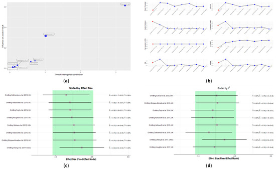 For fasting glucose, three studies (Cheng et al., Shojaee-Moradie et al., and Zelberg-Sagi et al.) [36,39,40] were detected as influential, as shown in the Baujat plot (Figure S24a). Cheng et al. [36] had the highest influence on the pooled effects and contributed to the highest overall heterogeneity. The study by Shojaee-Moradie et al. [39] had a moderate influence on the pooled effects and a moderate contribution to the overall heterogeneity. Based on its high sample size, Zelberg-Sagi et al. [40] were also identified as having an influence on effect size. All three studies had extreme values in the diagnostic tests for influential measures (Figure S24b). Omitting the Cheng et al. [36] study resulted in the least effect favoring the control group. Omitting the studies by Zelberg-Sagi et al. [40] and Shojaee-Moradie et al. [39] resulted in the highest effect favoring the exercise group (Figure S24c). Omitting these three studies resulted in the least heterogeneity (Figure S24d).