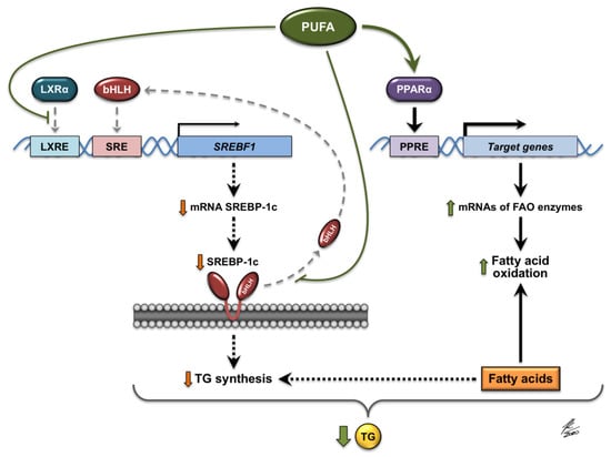 Lipids account for more than 30% of the total energy intake in the Western diet [30]. The most abundant dietary lipids are triglycerides, which consist of three fatty acids attached to a glycerol molecule. Ingested TGs are hydrolyzed in the digestive tract, resynthesized in enterocytes, and incorporated into chylomicrons. As part of chylomicrons, TGs are then transported in the blood to body tissues where fatty acids are released by LPL and absorbed. Dietary fatty acids not only serve as a source of energy to the body, but some also regulate metabolism. PUFAs, for example, influence the activity of transcription factors involved in the control of lipid metabolism, such as the sterol regulatory element-binding protein 1 (SREBP-1), the peroxisome proliferator-activated receptor α (PPARα), and the liver X receptor α (LXRα) [31,32,33,34].
