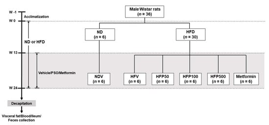 A total of 36 male Wistar rats (initial weights 180–200 g) were procured from Nomura Siam International, Bangkok, Thailand. All animal experiments and procedures were approved by the Ethics Committee of the Laboratory Animal Center, Chiang Mai University, Thailand (approval No. RT005/2562[02/2562-04-18] on 21 May 2019). All rats were housed in a plastic cage (two per cage) in a room with a controlled temperature (25 ± 1 °C), lighting (12 h light-dark cycle), and relative humidity. After a one-week acclimatization period, the rats were randomly assigned into two dietary groups and given either a normal diet (ND; 19.77% energy from fat, n = 6) or a high-fat diet (HFD; 59.28% energy from fat, n = 30) for 24 weeks [25]. The food intake and body weight of all rats were observed weekly. At week 13, ND-fed rats were treated with deionized water as a vehicle for an additional 12 weeks (NDV; n = 6). HFD-fed rats were separated into five subgroups (n = 6 for each subgroup). Each subgroup was orally gavaged with either vehicle (corn oil; HFV), 50 mg/kg perilla seed oil (PSO; HFP50), 100 mg/kg PSO (HFP100), 500 mg/kg PSO (HFP500), or 300 mg/kg metformin [26] (Novartis’ Galvus, Bangkok, Thailand; HFM) for an additional 12 weeks. The PSO was dissolved in a vehicle of corn oil because it lacked ALA. Metformin was used as a reference drug and dissolved in sterile drinking water. Following a 24-week experimental period, the rats were food-deprived for a minimum of 5 h. After the rats were anesthetized with isoflurane, plasma was collected from the tail vein to determine the glucose, insulin, lipid profiles, malondialdehyde (MDA), and LPS levels. The ileal and fecal samples were collected, immediately placed in liquid nitrogen, and stored at −80 °C until analysis. All experimental designs are presented in Figure 1.