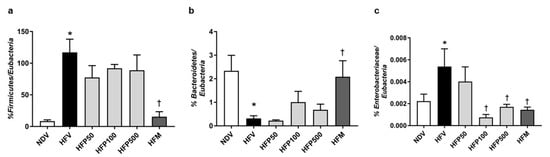 The effect of PSO administration on the composition of the gut microbiota in HFD-fed rats. (a) Percentage of Firmicutes/Eubacteria; (b) Percentage of Bacteroidetes/Eubacteria; (c) Percentage of Enterobacteriaceae/Eubacteria. Data are presented as mean ± SEM, * p < 0.05 versus the NDV group; † p < 0.05 versus the HFV group. HFD = High fat diet; NDV = Normal diet-fed rats treated with the vehicle; HFV = High fat diet-fed rats treated with vehicle.