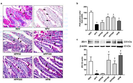 In the current study, intestinal barrier integrity was determined by the goblet cell quantification and tight junction protein levels in the ileum. Goblet cell quantification and tight junction protein levels were determined by PAS staining and ZO-1 expression, respectively. The HFV group significantly decreased intestinal barrier integrity, as indicated by decreased PAS-positive cells (Figure 3a,b), and downregulated the expression of tight junction ZO-1 in the ileum (Figure 3c) in comparison to the NDV group. Interestingly, treatment with 100 and 500 mg/kg/day of PSO and metformin equally increased PAS-positive cells (Figure 3a,b) and tight junction ZO-1 expression (Figure 3c) in comparison to the HFV group. These results showed that 100 and 500 mg/kg/day of PSO and metformin equally ameliorated the disruption of intestinal barrier integrity in HFD-fed rats.