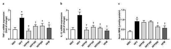 Effect of PSO on intestinal inflammation in obesity-induced insulin-resistant rats. (a) TNF-α mRNA expressions; (b) IL-1β mRNA expressions; (c) MDA levels. Data are presented as mean ± SEM, * p < 0.05 versus the NDV group; † p < 0.05 versus the HFV group. PSO = Perilla seed oil; TNF-α = Tumor necrosis factor-alpha; IL-1β = Interleukin 1 beta; MDA = Malondialdehyde; NDV = Normal diet-fed rats treated with the vehicle; HFV = High fat diet-fed rats treated with vehicle.