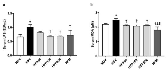 The effect of PSO on endotoxemia and oxidative stress in obesity-induced insulin-resistant rats. (a) Serum LPS level; (b) Serum MDA level. Data are presented as mean ± SEM, * p < 0.05 versus the NDV group; † p < 0.05 versus the HFV group; ‡ p < 0.05 versus HFP50; $ p < 0.05 versus HFP500.