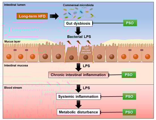 This schematic overview shows the effects of PSO treatment on obese-insulin-resistant rats. PSO alleviated HFD-induced gut dysbiosis, which results in decreased intestinal inflammation, systemic inflammation, and metabolic disturbance. HFD = high fat diet; LPS = lipopolysaccharide; PSO = perilla seed oil.