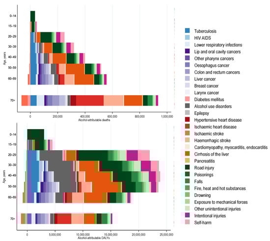 Alcohol-attributable deaths globally in 2016, by cause and age.