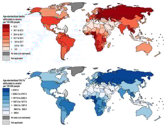 - Shield, K.; Manthey, J.; Rylett, M.; Probst, C.; Wettlaufer, A.; Parry, C.D.; Rehm, J. National, regional, and global burdens of disease from 2000 to 2016 attributable to alcohol use: A comparative risk assessment study. Lancet Public Health 2020, 5, e51–e61. [Google Scholar] [CrossRef]