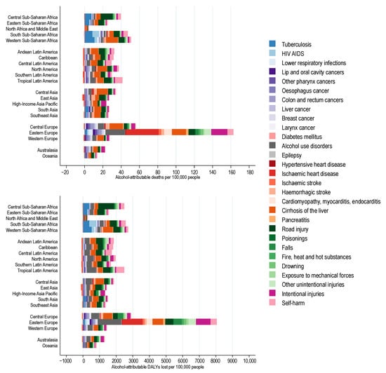The burden of premature disease attributable to alcohol consumption was highest in Eastern Europe, Central Europe, and Western sub-Saharan Africa. The Central and Eastern Europe region have a high overall volume of alcohol consumption and a high prevalence of HED [5,6]. Alcohol control policy measures, including increases in alcohol prices and decreases in availability, have been implemented in the Eastern Europe region and have resulted in marked downward shifts in mortality and the burden of disease [25]. The Western sub-Saharan Africa region has a relatively low overall volume of alcohol consumption. The burden of alcohol-attributable premature disease in this region was driven mainly by infectious diseases, liver cirrhosis, and injuries. Cirrhosis-related deaths doubled in the sub-Saharan Africa region between 1980 and 2010, with hepatitis B virus, hepatitis C virus, and alcohol use being contributing factors to this increase [26]. Furthermore, treatment of liver cirrhosis is unavailable in most parts of sub-Saharan Africa, due to a shortage of hepatologists and gastroenterologists, interventional radiologists, hepatobiliary surgeons, and pathologists [27].