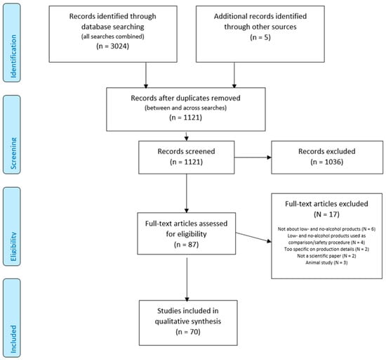 To be included in the review, papers had to include topics related to the production, consumption, and health impact of low- and no-alcohol products. There was no restriction on research design. To delineate the scope of our research, we only focused on peer-reviewed literature rather than grey literature. Original articles and reviews in English published in 2011 or later were included. For production, only reviews were included, as a detailed examination of production methods was not the focus of the paper. Papers not specific to low- and no-alcohol products were excluded.