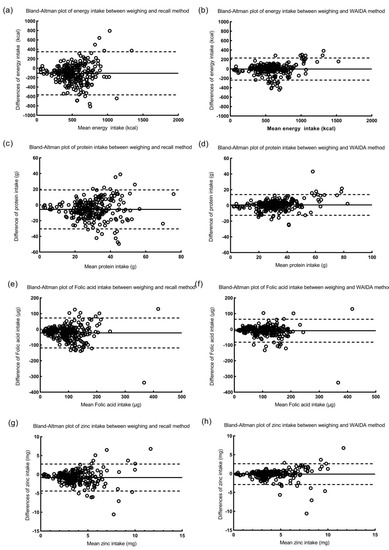 3.3. Bland-Altman Analysis of Energy and Nutrient Intakes from Those Estimated by the Weighing Method and the Recall or WAIDA Method
