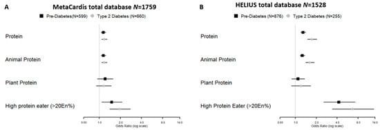 Despite differences in the two cohorts, protein intake was significantly associated with the MetaCardis (pre-T2D and T2D in both MetaCardis (pre-T2D: Odds Ratio (OR) 1.14 (Confidence Interval (CI):1.05–1.24); T2D: OR 1.18 (CI: 1.08–1.29)) cohort, as well as the HELIUS (pre-T2D: OR 1.29 (CI:1.18–1.41); T2D: OR 1.73 (CI: 1.49–2.03)) cohort, after adjustment for nutritional confounders, physical activity, age, and sex (Figure 1). Interestingly, the association could almost be fully explained by animal protein intake (MetaCardis pre-T2D: 1.14 (CI: 1.05–1.24) T2D: OR 1.18 (CI: 1.08–1.29); HELIUS pre-T2D: 1.26 (CI 1.16–1.37); T2D:1 1.61 (CI: 1.40–1.87)), but not by plant protein intake (MetaCardis pre-T2D: 1.21 (CI: 0.93–1.57); T2D:1.16 (CI: 0.90–1.48) HELIUS pre-T2D: 1.09 (CI: 0.88–1.36); T2D: 1.20 (CI: 0.88–1.66), in both cohorts. Similarly, being a high protein eater, i.e., proportion of the total energy intake attributable to protein >20%, was strongly associated with T2D and pre-T2D in both cohorts (MetaCardis pre-T2D: 1.50 (CI: 1.08–2.11) T2D: 1.97 (CI: 1.40–2.77; HELIUS pre-T2D: 4.23 (CI: 2.55–7.27); T2D: 6.66 (CI: 3.40–13.56)). In MetaCardis, we observed that the association between animal protein intake and T2D status was more pronounced in Caucasians vs. non Caucasians (interaction term: 0.15, p = 0.027), however this was not the case in HELIUS. Furthermore, the found associations were significantly attenuated by BMI (Supplementary Figure S1). This is likely due to overcorrection as BMI/obesity is involved in the causal pathway of insulin resistance [17]. We also provide univariate analysis results (Figure S2).