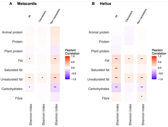 Association between macronutrient intake and alpha-diversity (Shannon Index) stratified on ethnicity in (A) MetaCardis cohort and (B) HELIUS cohort. Macronutrients are adjusted on energy intake, age, gender, BMI, T2D status, anti diabetic treatment and anti lipidic treatment using residuals. * p < 0.05; ** FDR adjusted p < 0.05.