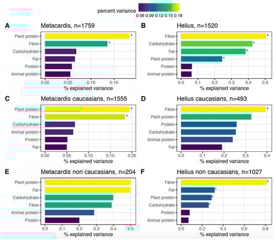 The beta diversity was calculated using the Bray-Curtis method in order to study the contribution of all macronutrients to the known explained variance of the gut microbiota (Figure 3). First, we found that the macronutrients that contributed the most to the explained variance were rather consistent in the two cohorts. Notably, dietary fiber had a significant association with beta diversity in both cohorts and was the one with the highest link in HELIUS and the one with second highest link in gut microbiota variance in MetaCardis. Interestingly, in both cohorts, total protein and animal protein had no significant association with beta diversity and were the macronutrients with the least explained variance, whereas plant protein had a significant association in both cohorts. Importantly, all these analyses were adjusted for potential confounders on microbiota composition and the significant effects are therefore independent of total caloric intake, age, sex, BMI, T2D status, and anti-diabetic and anti-lipid treatment intake (Figure 3A,B). We also stratified the analysis according to Caucasian vs. non-Caucasian ethnicity and found that total protein and animal protein were not significantly associated with beta diversity in either cohort, regardless of ethnicity (Figure 3C–F). Overall, after adjustment for confounders, protein and specifically animal protein intake were not significantly linked with gut microbial beta diversity in our two cohorts, regardless of Caucasian vs. non-Caucasian ethnicity.
