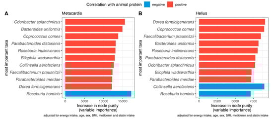 Most important taxa associated with animal protein intake with overlap in both cohorts (A) MetaCardis, (B) HELIUS.