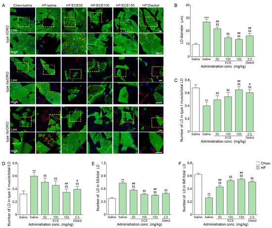 Effects of ECE and dieckol on lipid droplets (LDs) modulation in the muscle. (A) The images of low and high magnification show the myosin type I, IIa or IIb with oil red O staining. (B) The average size of LDs in the muscle was increased by HF/saline and decreased after treatment with ECE or dieckol. (C) The numbers of LDs in type I fiber were increased by ECE or dieckol treatment. (D) The numbers of LDs in type II fiber were increased by HF/saline and were decreased after treatment with ECE or dieckol. (E) The number of LDs in the SS muscle was increased by HF/saline and decreased after treatment with ECE or dieckol. (F) The number of LDs in the IMF muscle was decreased by HF/saline and increased after treatment with ECE or dieckol. Scale bar = 100 µm. Data are presented as mean ± SD. **, p < 0.01 and ***, p < 0.001 vs. Chow/saline; $$, p < 0.01 vs. HF/saline; #, p < 0.05 and ##, p < 0.01 vs. HF/ECE100 (Mann–Whitney U test). conc., concentration; ECE, Ecklonia cava extract; HF, high-fat diet; IMF, intermyofibrillar; SS, subsarcolemmal.