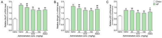 In this study, the non-parametric tests were used. To identify the significance of differences among the six groups, the Kruskal–Wallis test was conducted, and if a significant difference was confirmed, Mann–Whitney U test was used for multiple comparisons. All experiments conducted in this study were performed three times per mice, and the graph value of results were indicated as the mean ± standard deviation (SD). The statistical analysis was analyzed by SPSS version 22 (IBM Co., Armonk, NY, USA) and symbols of all data were used *, $, and # (*, vs. Chow/Saline; $, vs. HF/Saline; #, vs. HF/ECE100).