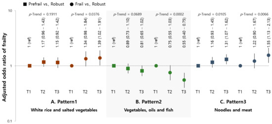 Adjusted ORs (95% CI) for pre-frailty and frailty according to the tertile of dietary pattern scores. (A) “White rice and salted vegetables”; (B) “Vegetables, oils, and fish”; (C) “Noodles and meat.” Ref.: reference category; OR: odds ratio; CI: confidence interval. Data were calculated using the multinomial SURVEYLOGISTIC model. ORs (95% CIs) were adjusted for gender, age, BMI, living status, residential area, family income, education level, smoking status, high-risk alcohol consumption, comorbidity, and energy intake.