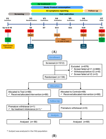 The study was monocentric, randomised, double blind, controlled, with two parallel arms (Test/Control, allocation ratio 1:1) and an adaptive design with interim analysis. As described in Figure 1A, the study included a screening phase, 14-days of Hp eradication treatment (D0-D14), 28-days of product consumption (D0-D28) and 14-days of follow-up (D28-D42), with dietary restriction (D0-D42) (no yogurts, probiotics in fermented dairy products, or supplements). Seven visits were planned, in a clinical unit (Charité Research Organisation GmbH, Berlin, Germany): for inclusion (V1), randomisation (V2-D0), and evaluation (V3-D7 to V7-D42), with blood (fasted) and stool sampling as described in Figure 1A and Supplementary Materials. Additional stools were collected at the first day and after the end of each AAD episode. The study was performed in accordance with the Declaration of Helsinki and Good Clinical Practice (International Conference on Harmonisation E6) and approved by the Ethics Committee of Charité–Campus Mitte (Application Number EA1/297/15) of the Charité–Universitätsmedizin Berlin, Germany. All volunteers provided a signed informed consent form (ICF). The trial was registered on clinicaltrials.gov (registration number: NCT02900196).