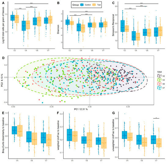 Global gut microbiota response to Hp treatment and product intervention. (A) Total bacterial count/g fecal samples assessed by flow cytometry, with a log10 transformation. (B) Alpha-diversity assessed by Shannon index (C) Alpha-diversity assessed by Simpson’s Reciprocal. (D) Principal Coordinate Analysis (PCoA) based on Bray–Curtis dissimilarity. Samples were collected before (V2) and after Hp treatment (V4), 14 days (V6) and 28 days (V7) following cessation of Hp treatment. * p < 0.05 and *** p < 0.001 according to linear mixed model. (E–G) Intra-subject distance to baseline of each subject in Test and Control groups across the study (E) Bray–Curtis dissimilarity (F) Weighted UniFrac distance (G) Unweighted UniFrac distance. * p < 0.05 and *** p < 0.001 according to Mann–Whitney test.