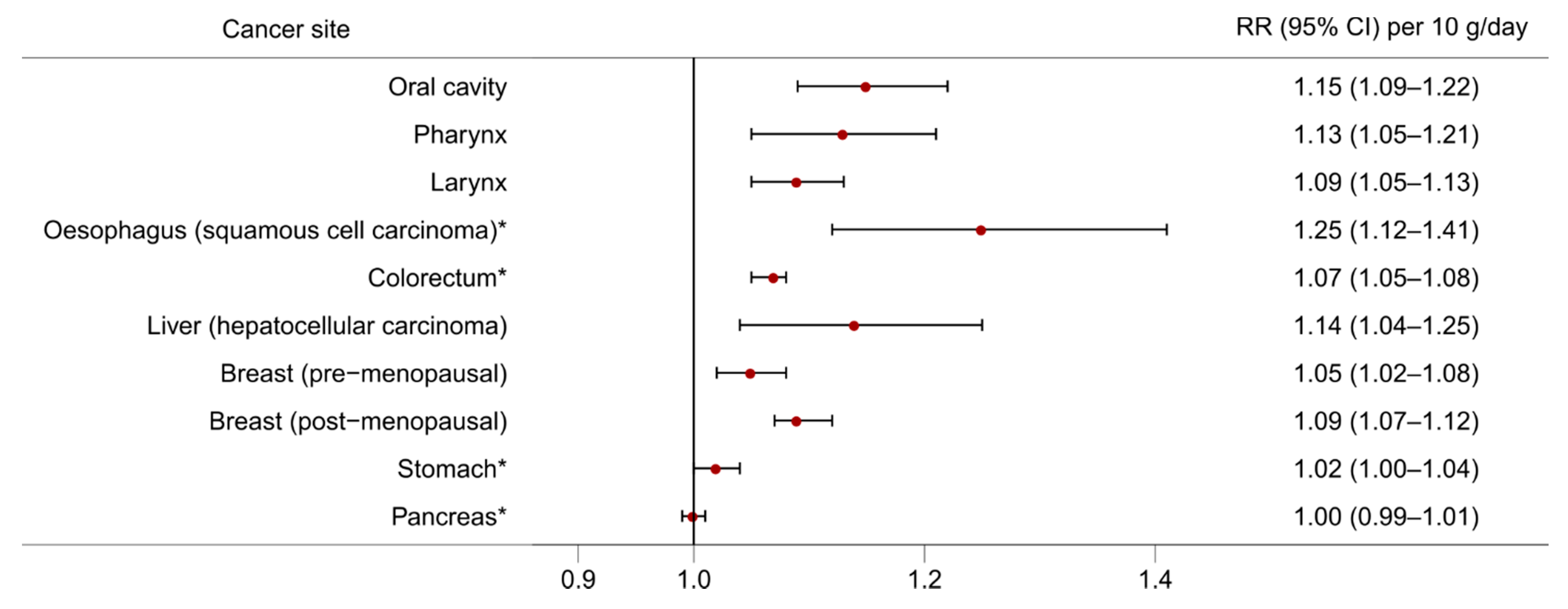 - Bagnardi, V.; Rota, M.; Botteri, E.; Tramacere, I.; Islami, F.; Fedirko, V.; Scotti, L.; Jenab, M.; Turati, F.; Pasquali, E.; et al. Alcohol consumption and site-specific cancer risk: A comprehensive dose–response meta-analysis. Br. J. Cancer 2014, 112, 580. [Google Scholar] [CrossRef]