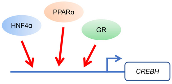 Hepatic CrebH mRNA is apparently increased by peroxisome proliferator-activated receptor α (PPARα) [2], hepatocyte nuclear factor 4α (HNF4α) [3], and glucocorticoid receptor (GR) [4] during fasting (Figure 1). Subsequently, CREBH controls fasting-induced gene expression in the liver and maintains nutrient condition to adapt to fasting. Thus, CREBH deficiency leads to various metabolic disorders, such as fatty liver, hyperlipidemia, and atherosclerosis.