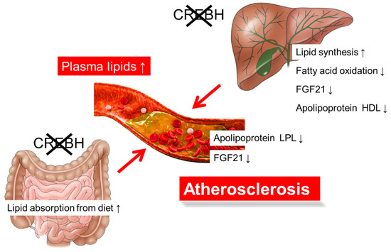 The metabolic dysfunctions in CREBH deficiency in low-density lipoprotein receptor knockout (LDLR KO) mice exacerbate atherosclerosis. Deficiency of CREBH in the liver exhibits the activation of lipid synthesis, inactivation of fatty acid oxidation and FGF21 expression, and abnormal function of apolipoprotein metabolism, increasing plasma lipid levels. Deficiency of CREBH in the small intestine increases lipid absorption from diet, increasing plasma lipid levels. Metabolic dysfunction due to CREBH deficiency in both the liver and small intestine of CREBH KO:LDLR KO mice synergistically increases plasma lipid levels and accelerate atherosclerosis development. ↑, level increased; ↓, level decreased.