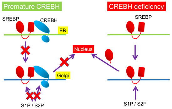 Sterol-regulatory element-binding proteins (SREBPs) are also membrane-bound transcription factors including SREBP-1a, -1c, and -2 to regulate the biosynthesis and uptake of lipids [56]. SREBP-1a regulates the gene expression related to the production of phospholipids, fatty acids, and cholesterol [56]. SREBP-1c regulates the gene expression related to the synthesis of fatty acids and triglycerides in response to overnutrition [56]. SREBP-2 maintain cholesterol levels to control the gene expression of the cholesterol synthesis-related genes in response to the demands on cellular sterols [56]. SREBPs and CREBH share the same posttranslational activation system, RIP. Both factors are localized in the ER and are transported to the Golgi, where they are cleaved by site-1 and site-2 proteases (S1P and S2P) (Figure 4). CREBH is activated by energy shortage, while SREBPs are activated by overnutrition. CREBH and SREBPs balance to regulate lipid metabolism at the transcriptional level. Cleaved factors are transported into the nucleus. SREBP cleavage-activating protein (SCAP) binds to SREBP and promotes the transport of SREBP from the ER to the Golgi. Insulin-induced gene 1 (Insig-1) and 2 (Insig-2) form a complex with SREBP-SCAP, inhibiting SREBP transport to the Golgi [57,58,59]. CREBH directly induces Insig-2a mRNA, a liver-specific isoform of Insig-2, in the liver, which downregulates the translocation of SREBP-1c and reduces de novo lipogenesis [60]. CREBH inhibits hepatic de novo lipogenesis via the induction of Insig-2a, thereby preventing hepatic steatosis and hypertriglyceridemia [60]. CREBH downregulates de novo lipogenesis, while SREBP activates it (Figure 2), thus indicating that the functions and activation conditions of CREBH and SREBP are complementary. If premature SREBP and CREBH coexist in the ER membrane, both factors physically interact with each other. This association reciprocally inhibits the transport from ER to Golgi each other (Figure 4) [52]. Consistent with this observation, deficiency of CREBH in the liver increased the level of nuclear SREBP, while deficiency of SREBP-1 in the liver increased the level of nuclear CREBH [52]. However, the overexpression of the nuclear form of CREBH does not change SREBP-target gene expression in the liver [52]. CREBH suppresses SREBP activation by intermolecular interaction and insig-mediated regulation.